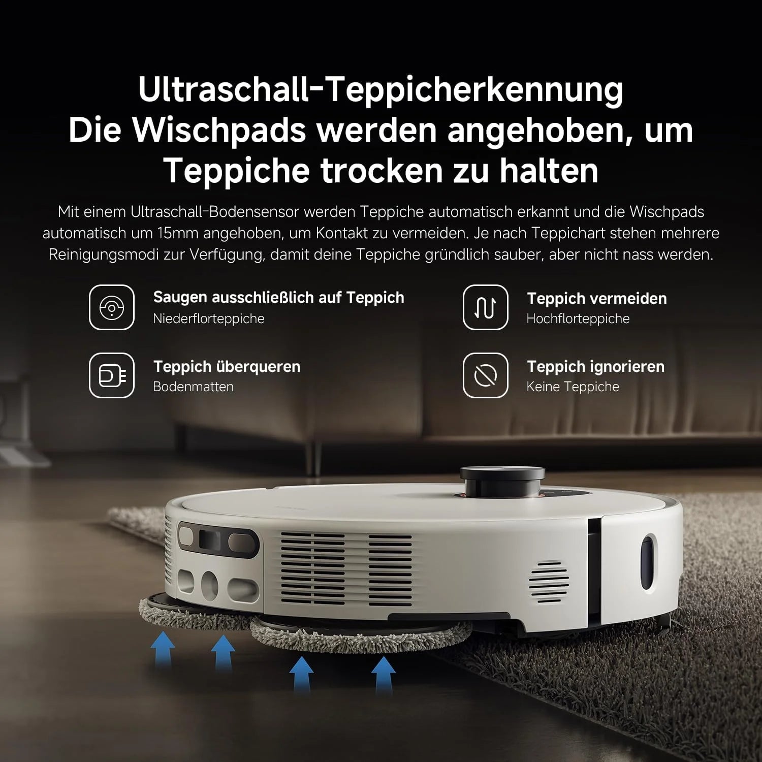 Ausgestattet mit rotierenden Borsten, einer starken Saugleistung, einem Mikrofaser-Wischpad, intelligenter Navigation und flüsterleisem Motor gleitet er mühelos durch Deine Räume. Die leistungsstarke 1800mAh Batterie bietet bis zu 90 Minuten Betriebszeit. Dank seines kompakten Designs erreicht er auch schwer zugängliche Stellen wie unterm Sofa oder Bett.